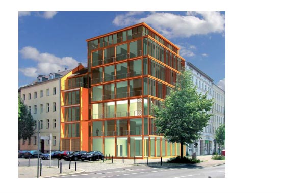 Öko-Lofts Berlin Die Bebauung des Eckgrundstücks nimmt je Bezug auf die sehr unterschiedliche Straßenrandbebauung. Die Wohnungen in den Stockwerken sind als lofts konzipiert. BHKW und Bauteilheizung nach dem System HypoThermos sorgen für sehr niedrige Emissionswerte.